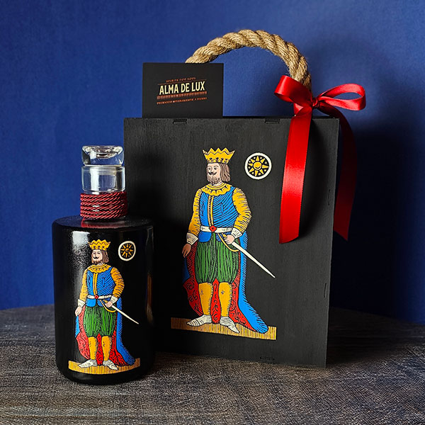 La bottiglia da 500 ml, riempita con uno dei nostri liquori artigianali a scelta (tranne il gusto Sigaro), è decorata interamente a mano con colori acrilici e riporta il soggetto del 10 di Denari, rendendo ogni pezzo irripetibile. Lo stesso decoro viene ripreso sulla scatola in legno con coperchio scorrevole, creando un insieme coerente e di forte impatto visivo, dove contenuto e confezione dialogano tra loro.