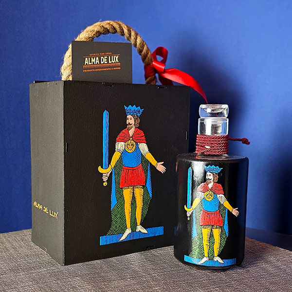 La bottiglia da 500 ml, riempita con uno dei nostri liquori artigianali a scelta, è decorata interamente a mano con colori acrilici e raffigura il 10 di Spade, rendendo ogni pezzo unico e irripetibile. Il decoro viene ripreso anche sulla scatola in legno con coperchio scorrevole, creando una forte coerenza visiva tra contenuto e confezione e trasformando il prodotto in un oggetto di valore artigianale e simbolico.